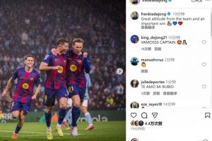 染红离场!德容社媒庆祝取胜:球队展现很棒的态度,收获重要胜利